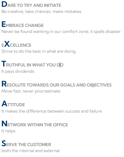 RICE is a staple diet of Asian people; deeply entrenched within the social fabric of its rich culture. Dextrans Worldwide, an Asian based organization, functioning within the logistics arena with the bulk of our human born, bred and rooted in this ancient civilization, take pride in embracing the Dextran’s employee’s creed bearing the acronym RICE.